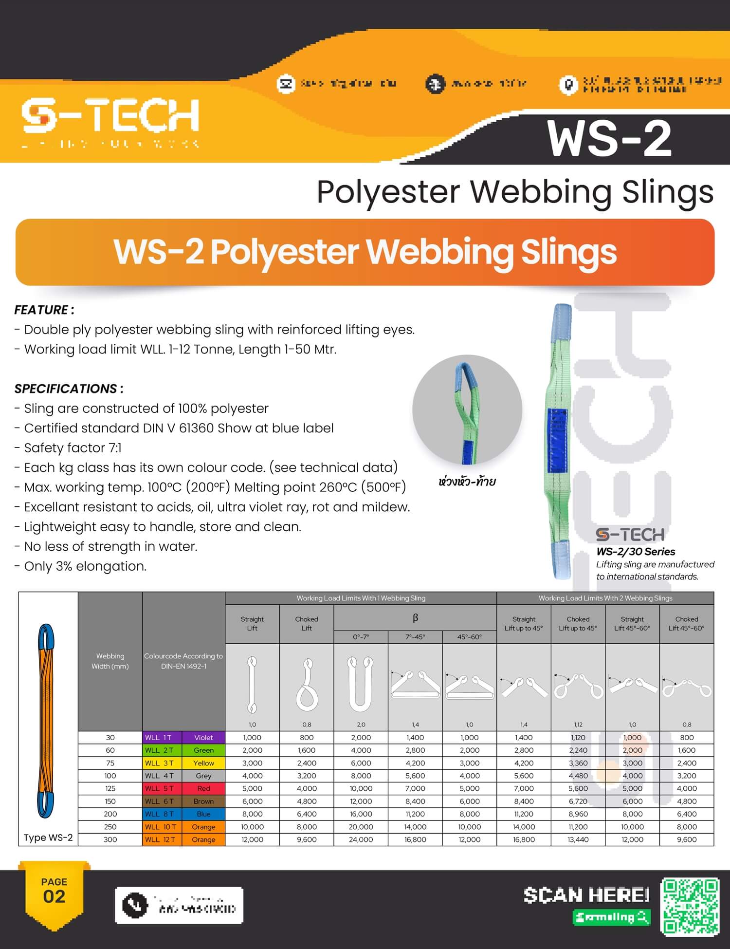 S-TECH (ญี่ปุ่น) WS-2 สลิงโพลีเอสเตอร์แบน เย็บ 2 ชั้น แบบห่วงหัว-ท้าย (เพิ่มปลอกกันคม) S/F 7:1 ยี่ห้อ S-TECH *สินค้ามีใบ Certificate/ใบรับรองจากโรงงาน*